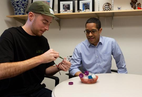 Graduate student Trevor Johnston puts the 3D-printed hydrogel back in it’s container as professor Alshakim Nelson watches. Photo credit: Kandace Kimball