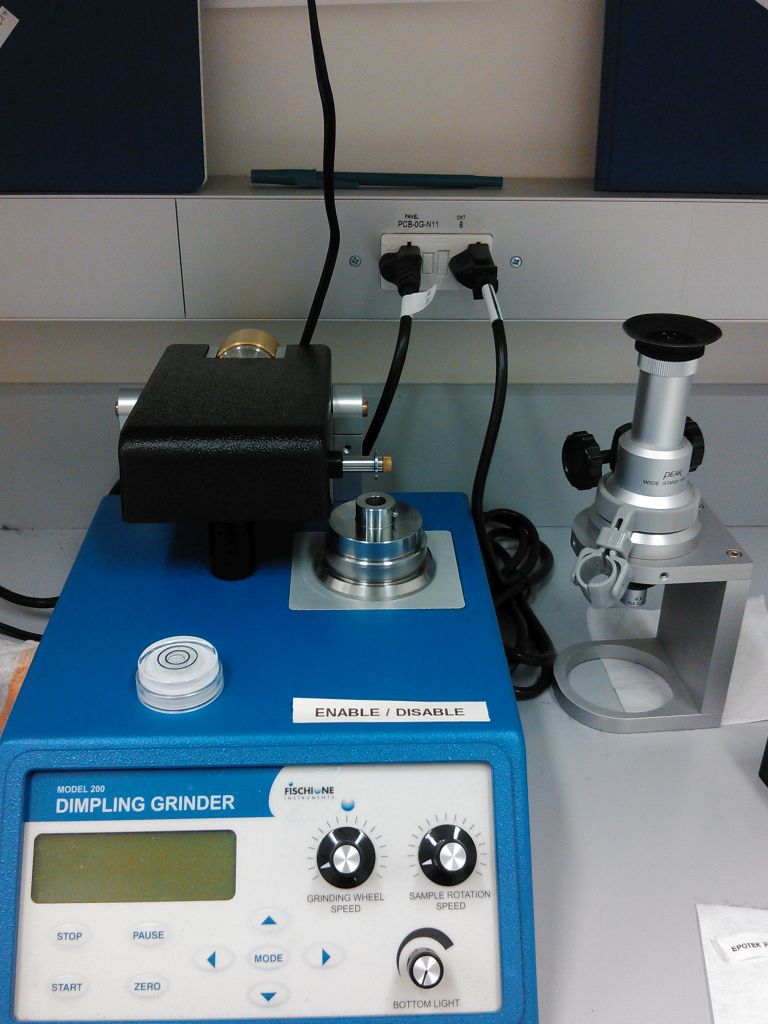 The Fischione Dimple Grinder is an intermediate step in the preparation of hard (conventional) materials for TEM analysis. Dimple grinding follows planarization and polish and precedes ion-milling. This mechanical grinder thins only the central area of a TEM sample and leaves the outer edge thick enough to handle with tweezers. The area of interest can be precisely positioned at center using a 40X optical microscope.  Final thickness at the center of the sample is just a few micron and can be quickly ion polished to remove scratches. Capable of both 1-sided and double-sided dimple grinding with 1um resolution. Prethins TEM samples up to 200um thick in preparation for ion polishing.