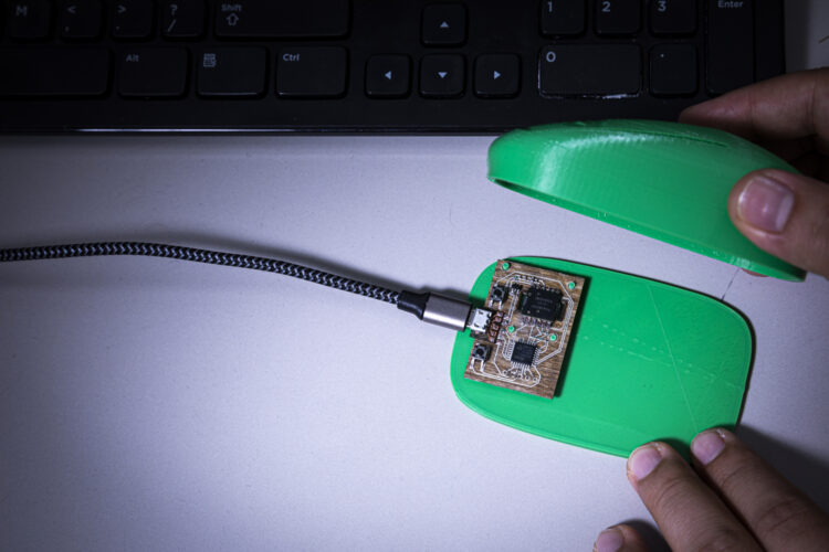 We optimized our circuit design to use the fewest number of silicon chips possible, because around 80% of carbon emissions associated with manufacturing electronics comes from the energy-intensive processes used to make chips. We use biodegradable materials when possible. For example, the circuit board that holds and connects the chips together typically contains toxic flame-retardants, but we instead pattern our circuits on a board made from flax fibers. Also, the casing for the mouse is made out of biodegradable plastics. We use general-purpose, programmable chips, like microcontrollers, in our designs so that we can reuse them in new devices. We use software to estimate the environmental impact of each stage of production to quantify the environmental impacts and identify which stages of our design to improve next.