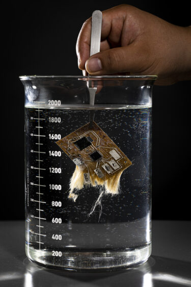 VI : When we submerge our circuit board in water, the fibers start to come apart and the whole thing just disintegrates. This takes about five to 10 minutes in hot water, or a few hours at room temperature. After this we're left with the chips and circuit traces which we can filter out. We also designed two different cases, one of these can dissolve in water and the other can be commercially composted.