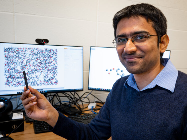 Aniruddh Vashisth is holding a sample of a “healable” carbon-fiber composite material that his team studies, next to a monitor displaying the fiber's molecular structure. Credit: Andy Freeberg/University of Washington