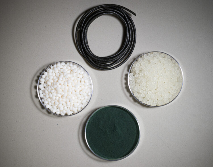 Materials from Eleftheria Roumeli’s lab that can be used to make compostable filaments for 3D printing. Clockwise starting from the top are: a hybrid material made from a blend of spirulina powder blended with polylactic acid pellets (black string); polylactic acid pellets alone (off-white balls); spirulina cells in powder form (green powder); and polybutylene adipate co-terephthalate pellets (white balls). Credit: Mark Stone/University of Washington